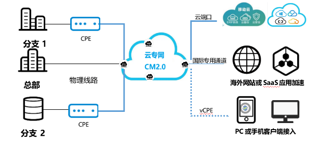 中国移动智能组网系列产品是MPLSVPN产品的升级版,为客户提供多类型、多技术、多云的泛在接入能力,实现接入即组网,接入即入云,能够为客户快速构建一张专属全域私有网络,同时还可依托中移国际专用通道为国内客户提供国际访问加速和应用加速。