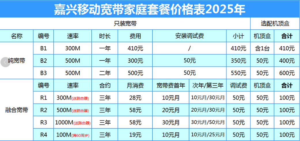 嘉兴市秀洲区东方新家园北区 移动宽带套餐 2025年4月资费价格